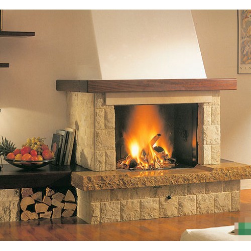 Из массива дерева сделана и верхняя балка этого камина. К этой модели в качестве опции прилагается также банкетка с деревянной крышкой 70х65 см, которая может располагаться слева или справа от камина.